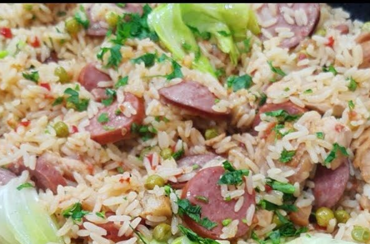 Assaisonner le poulet avec l’ail, l’oignon, le jus de citron et l’ail, saler au goût. Coupez ensuite le poulet en morceaux et faites-le revenir dans la grande poêle, ajoutez les lardons hachés. Une fois doré, ajoutez l’oignon, les tomates hachées, le poivre, les morceaux de pepperoni, le riz et les piments verts.