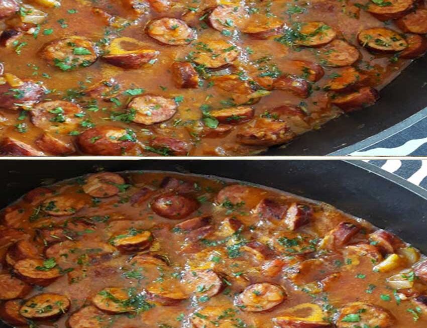 Dans une cocotte, faites dorer les oignons avec l’huile et ajoutez les saucisses coupées en morceaux.
