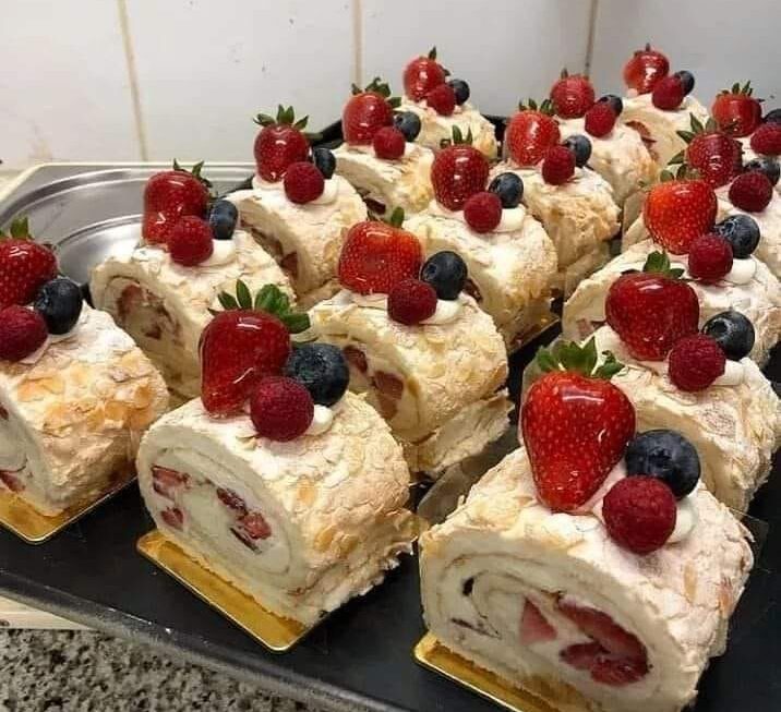 Après avoir été égalé, on le couvre d’un mouchoir humide et on le laisse refroidir, après qu’il refroidit, on l’enlève du papier cuisson, on le boit avec des moustaches, on distribue la crème et coupe la fraise doucement avec pression, puis on l’emmène au congélateur pour tenir le coup. Une fois que ça se tient, nous distribuons de la crème sur le mal de biscuits et décorons les tranches d’amandes puis les fruits disponibles à l’aide de la crème, et la décoration reste certainement facultative.