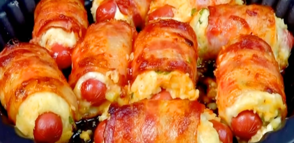Ingrédients: 600 g de pommes de terre Sel Oignon de printemps 100 g de fromage Poivre noir 8 hot-dogs 8 tranches de bacon fumé Huile d’olive Paprika fumé Poudre d’ail 1 cuillère à soupe de ketchup