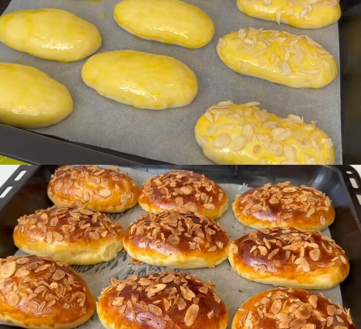 - Préchauffez le four à 180 °C (350 °F). Badigeonnez les petits pains avec le jaune d’œuf, saupoudrez d’amandes effilées et faites cuire environ 20 minutes jusqu’à ce qu’ils soient dorés.