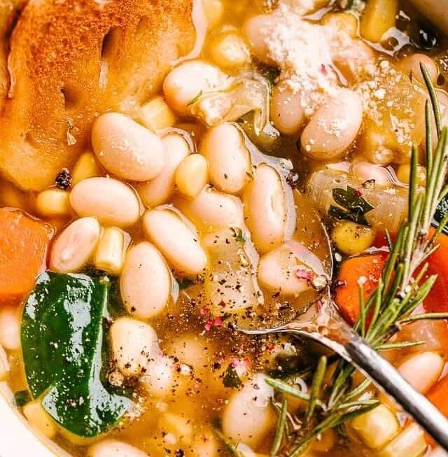 Cette soupe aux haricots blancs facile est remplie de légumes frais et vous gardera au chaud tout l’hiver. Il est également compatible avec le congélateur, alors n’oubliez pas d’en congeler pour plus tard!