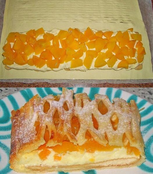 couper les pêches en petits dés et les répartir par-dessus. Rabattre la pâte feuilletée, la presser et la badigeonner de blanc d’œuf.