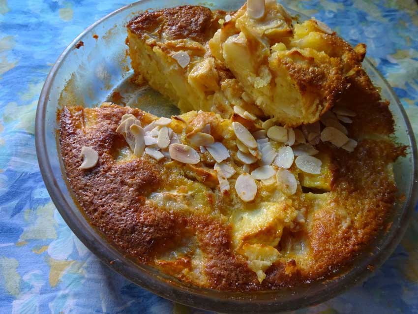 Enfournez pendant 35 minutes, sortez le gâteau du four, saupoudrez de sucre vanillé ( deuxième sachet) et d’amandes