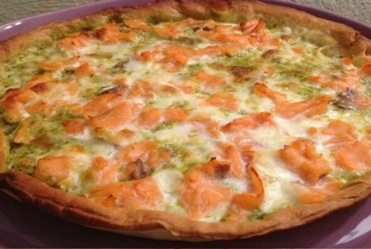 Mettre la pâte au four à TH3 pendant quelques minutes pour qu’elle dore légèrement (elle ne doit être ni trop dure ni trop molle). A la sortie du four, la laisser reposer et ajouter la crème fraîche, les oignons émincés, le saumon émincé, le poivre (généreusement) et le sel et saupoudrer de fromage râpé.