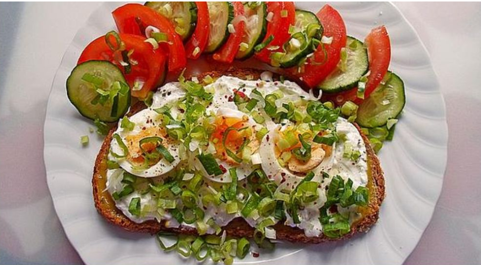 Tartiner la tranche de pain de moutarde (au lieu de beurre) – répartir le fromage blanc aux herbes dessus. Poser les tranches d’œuf sur le séré et assaisonner. Disposer joliment les tranches de concombre et de tomate au-dessus du pain et sur le bord de l’assiette et assaisonner. Parsemer le tout de petits rouleaux d’oignons.