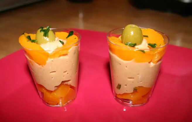 Et pour finir, décorez chaque verrine avec des lamelles de pêches coupées très fines. Ajoutez 1 olive. Parsemez avec de la ciboulette finement ciselée. Mettez au frais jusqu’au moment de servir.