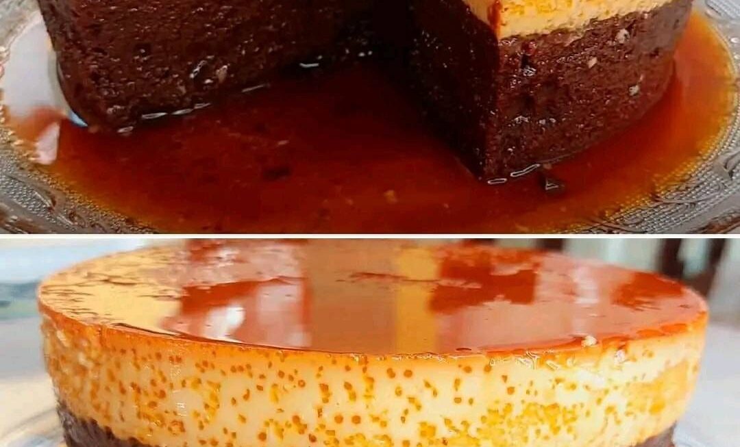 6. Versez le mélange de gâteau au chocolat dans une fontaine réfractaire préalablement graissée avec un aérosol de cuisson et versez le flan sur le dessus.