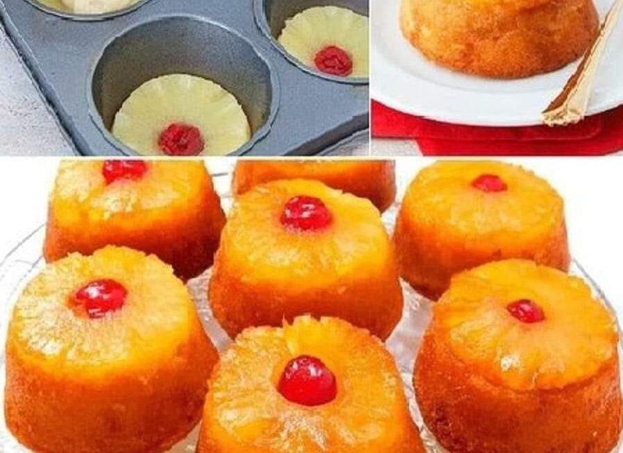 4. Filtrez l’ananas et réservez le jus pour préparer le mélange à gâteau. Coupez chaque tranche en 8 parts et placez 3 parts dans chaque moule. Coupez ensuite chaque cerise en deux et mettez une moitié dans chaque moule.
