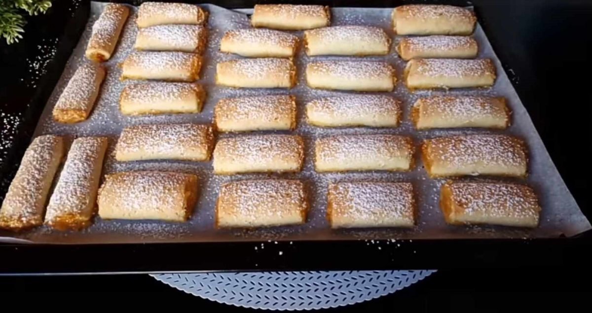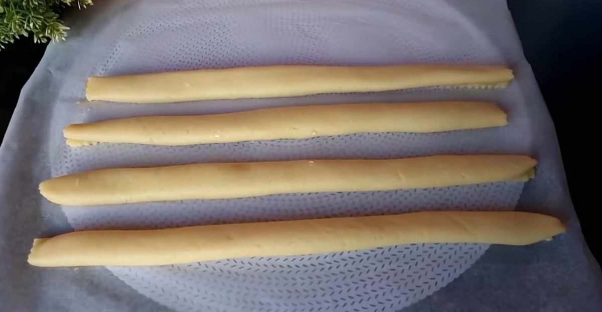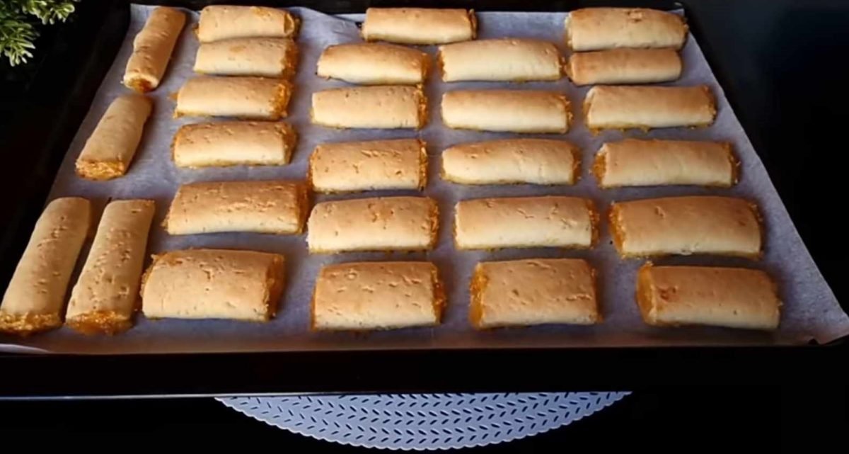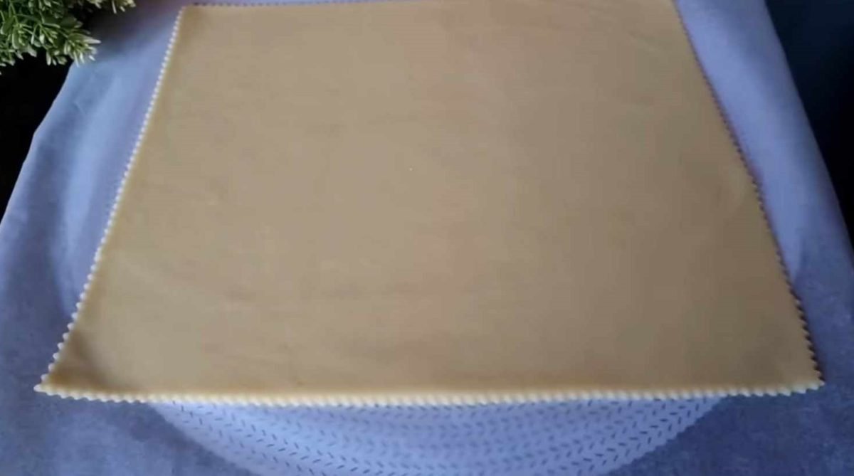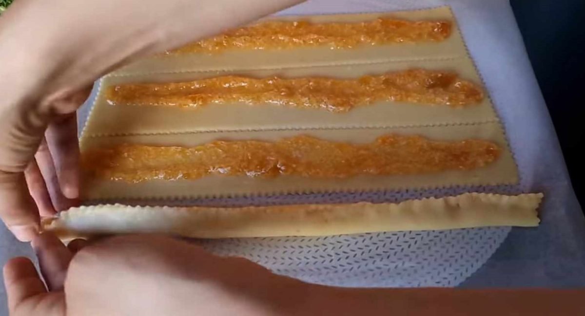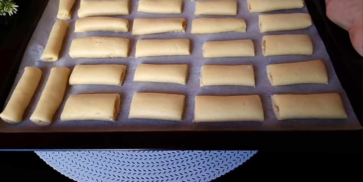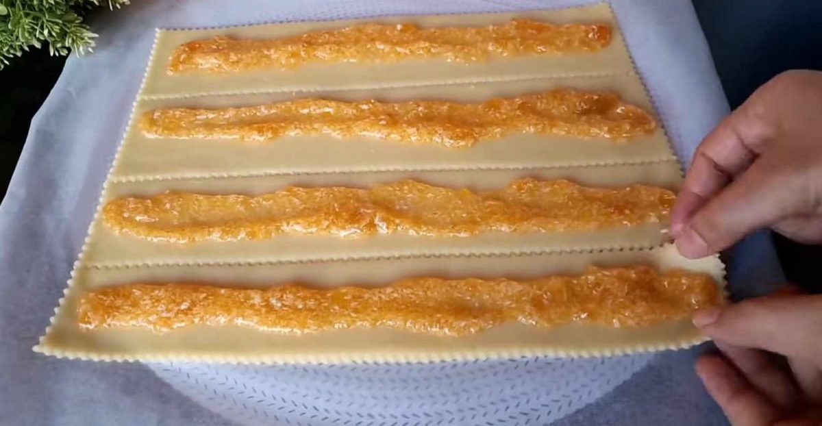 Coupez la pâte garnie en rectangles et pliez chaque rectangle en deux, fermant la garniture à l’intérieur. Ensuite, coupez chaque rectangle en petits morceaux rectangulaires.