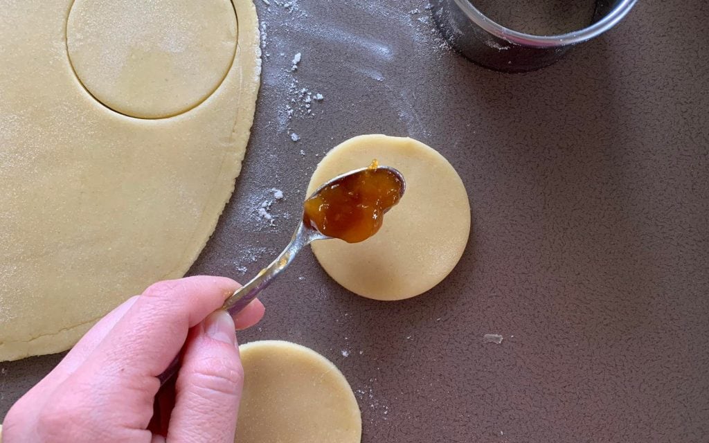 Remplissez chaque disque d’une cuillère à café de confiture, à placer exactement au centre6.