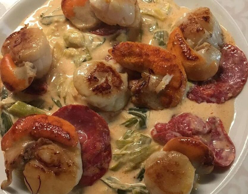Dans une assiette mettre les poireaux à la crème puis déposer les tranches de chorizo, mettre une noix de Saint-Jacques sur chaque tranches de chorizo, puis saler légèrement à la fleur de sel.