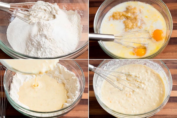 4. Versez le mélange d’ingrédients secs dans le mélange banane et œuf. Remuez le tout jusqu’à ce qu’une masse homogène se forme. Ne pas trop mélanger ; Il est normal qu’il reste quelques petits grumeaux.