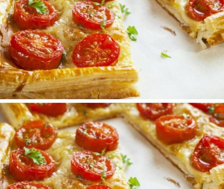 La pâte feuilletée doit être garnie de tomates cerises coupées en deux. Ensuite, versez avec précaution le mélange d’œufs sur environ deux tiers de la longueur du moule, en veillant à ce qu’il soit réparti uniformément. Saupoudrer le mélange d’une combinaison de parmesan et de thym pour plus de saveur.