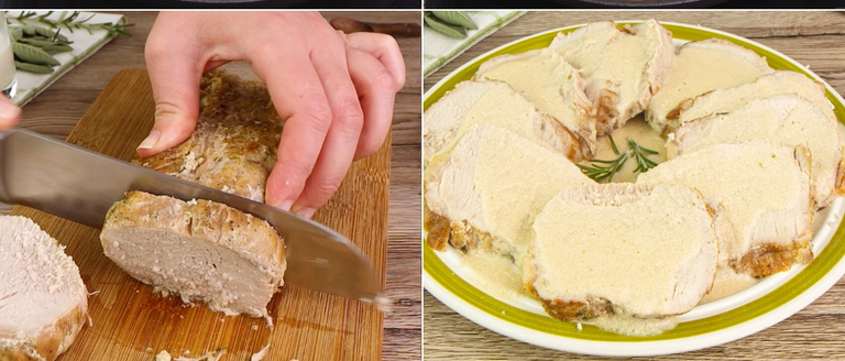 Retirez la ficelle de cuisine de la viande, coupez-la en tranches et arrosez-la avec la sauce.