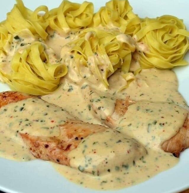 Escalopes de poulet, sauce crémeuse citronnée à l’estragon, persil et ciboulette