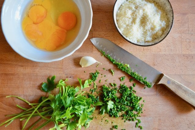 Ajouter le fromage caciocavallo râpé, le persil haché et l’ail4, les œufs et une pincée de sel et de poivre et bien mélanger.