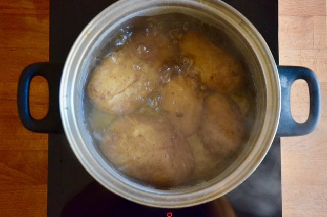 Lavez les pommes de terre et faites-les bouillir dans de l’eau salée jusqu’à ce qu’elles soient tendres ; cela prendra environ 40 minutes1.