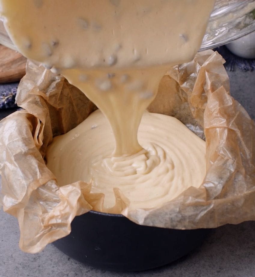 Verser la pâte dans un moule à gâteau de 8 pouces tapissé de papier parchemin. Cuire au four à 170°C/350°F pendant 1 heure.