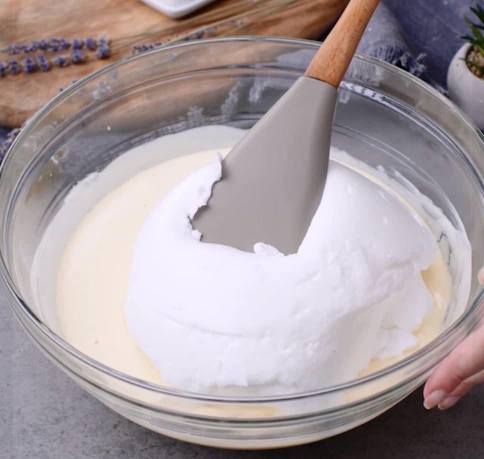 Incorporer les blancs d’œufs montés en neige dans la pâte.