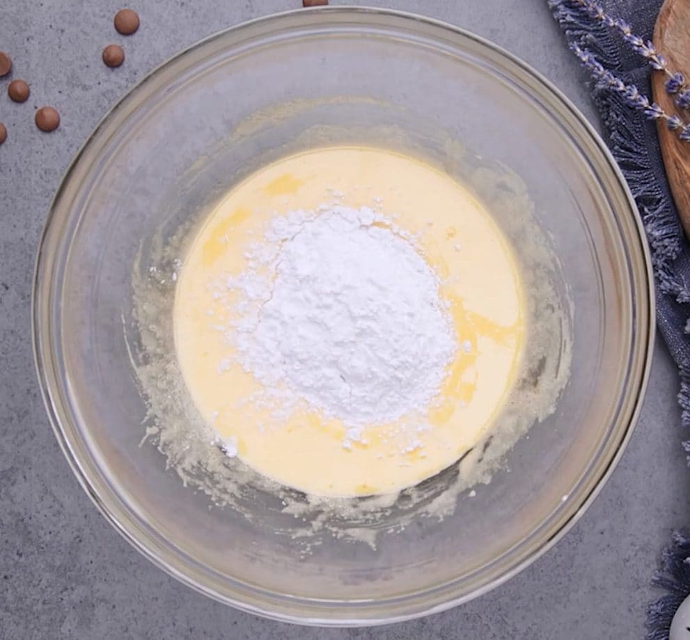 Ajouter la levure chimique et la fécule de maïs et fouetter à nouveau.