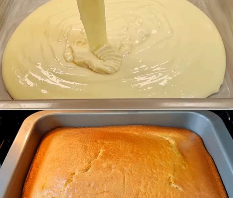 Nous continuons à remuer avec le fouet jusqu’à ce qu’il n’y ait plus de grumeaux et versons le mélange sur le moule puis le mettons au four. Nous le cuisons pendant 25 à 30 minutes selon le four.