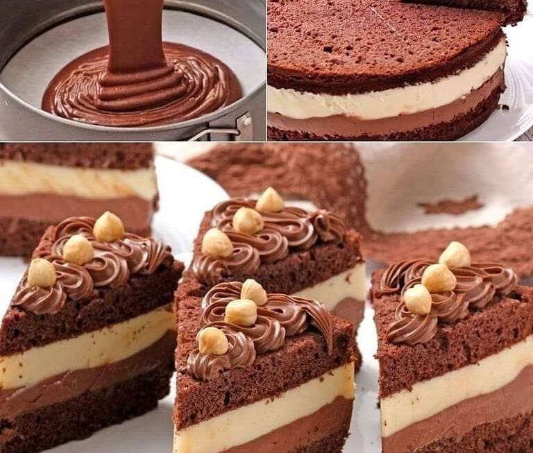 Couper le biscuit en deux, imbiber chaque gâteau de sirop. Mettre de la crème blanche sur le gâteau, puis de la crème au chocolat. Couvrir d’un gâteau. Refroidir pendant 6 heures.