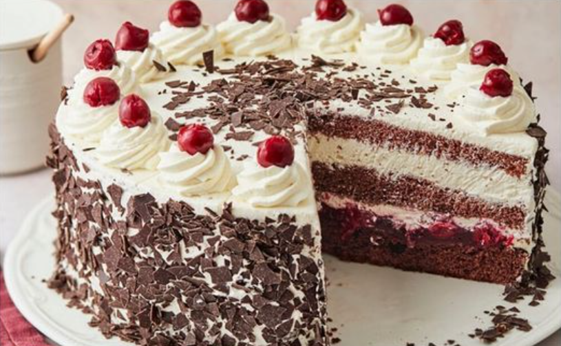 Couper la base du gâteau en deux ; saupoudrer la partie inférieure d’un peu de kirschwasser et recouvrir du mélange de cerises. Laisser refroidir.