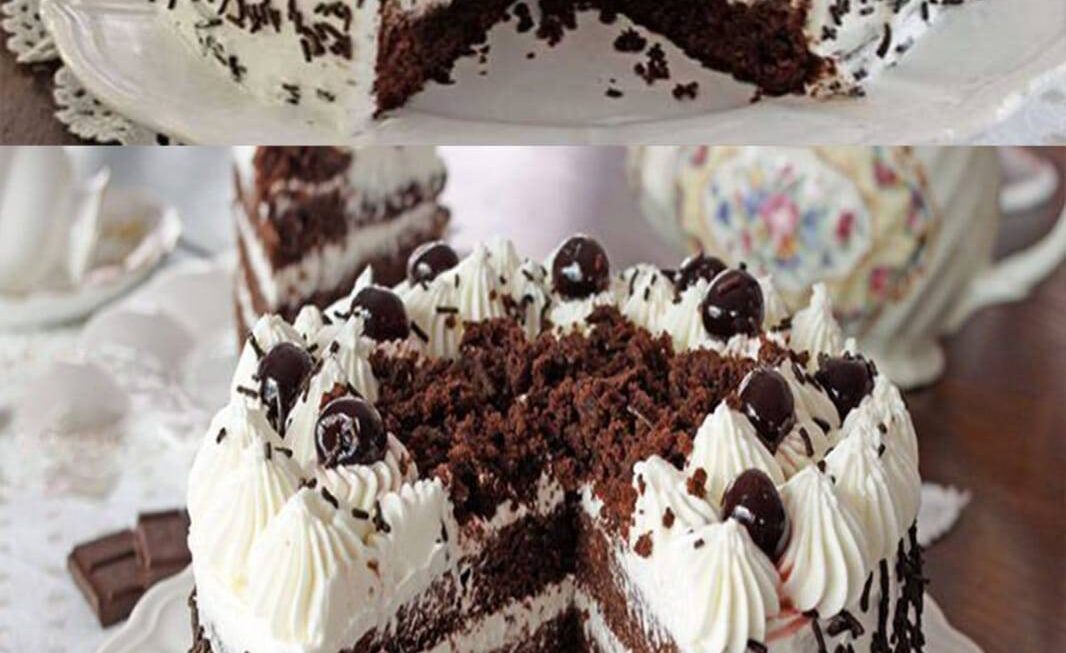 Couper la base du gâteau en deux ; saupoudrer la partie inférieure d’un peu de kirschwasser et recouvrir du mélange de cerises. Laisser refroidir.