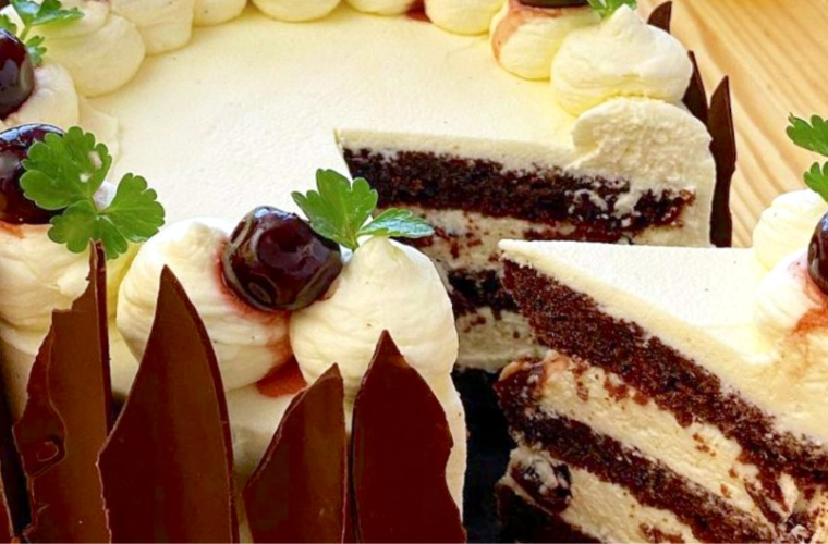 - Assemblez maintenant le dessert en alternant les couches de génoise imbibée de sirop de cerises noires, de crème mascarpone, de cerises noires hachées.