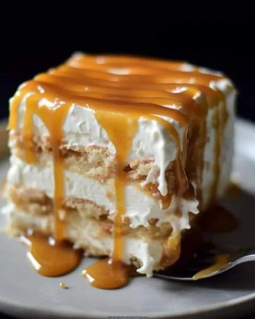 Avant de servir, vous pouvez garnir le gâteau avec un supplément de sauce caramel salé, de crème fouettée ou de crackers Ritz concassés, si vous le souhaitez.