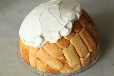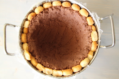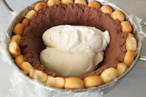 Dans le même bol que la crème, fouetter le mascarpone, la crème , le sucre à grande vitesse jusqu’à ce que la crème soit épaisse et ferme. Remplir le fond du gateau avec cette crème, afin de couvrir tout le gâteau.