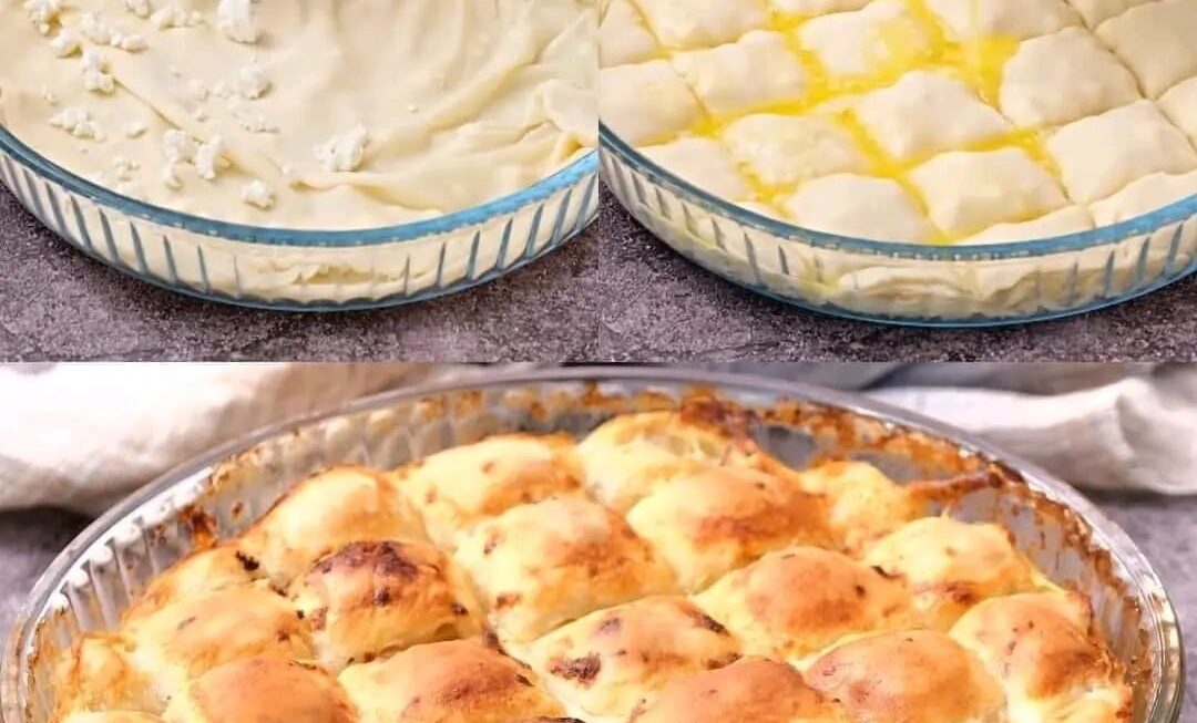 Divisez la pâte en 12 parties. Rouler les gâteaux. Étalez les gâteaux et le fromage cottage en alternant avec les couches. Coupez le gâteau en carrés. Garnir de beurre fondu. Cuire au four 20 minutes à 180°C / 350°F.