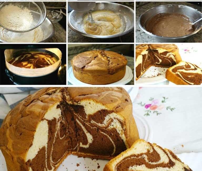6.- Verser le gâteau dans le moule en alternant la masse des deux bols. Passer une cuillère à travers le centre pour obtenir des dessins marbrés.