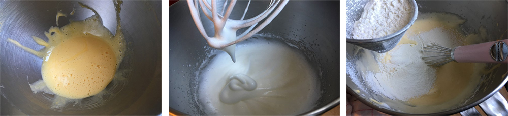Fouetter les jaunes d’œufs avec le sucre jusqu’à ce que le mélange blanchisse puis incorporer la farine tamisée.