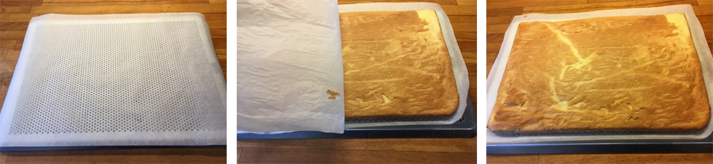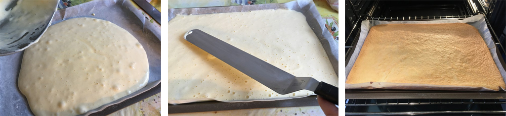 A la sortie du four, démouler la génoise sur un torchon humide, rouler la génoise avec le torchon qui remplace la garniture. Couvrir et laisser refroidir.