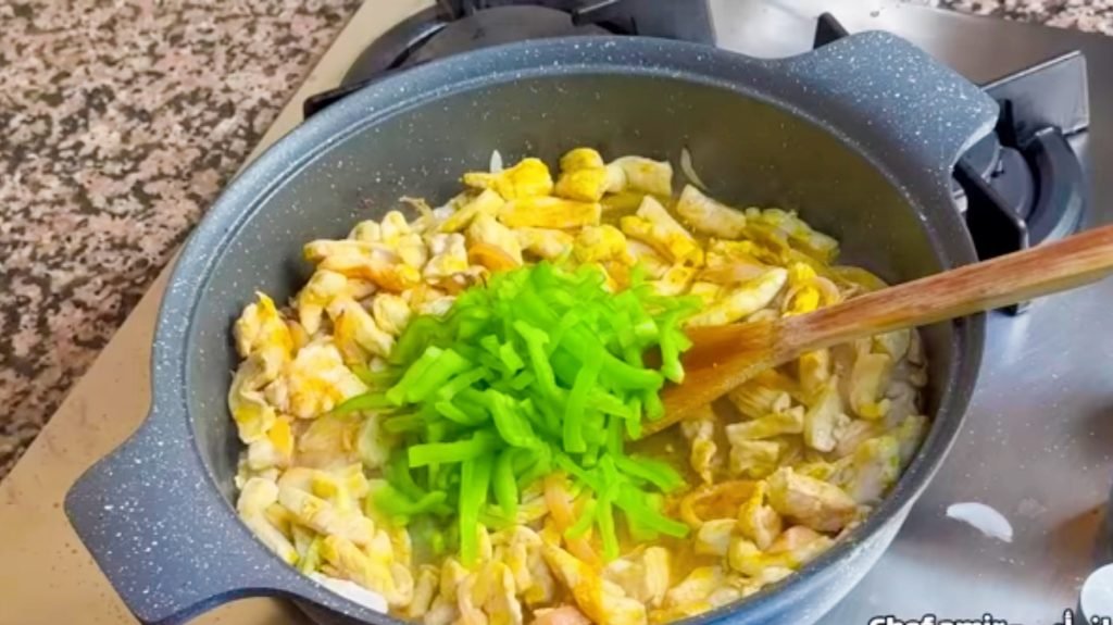 2. Préparez le Poulet: Dans une poêle, faites cuire les morceaux de poulet avec les oignons émincés jusqu’à ce qu’ils soient dorés. Ajoutez les lamelles de poivron vert, assaisonnez avec du sel, du poivre et les épices de votre choix. Laissez cuire jusqu’à ce que les légumes soient tendres.