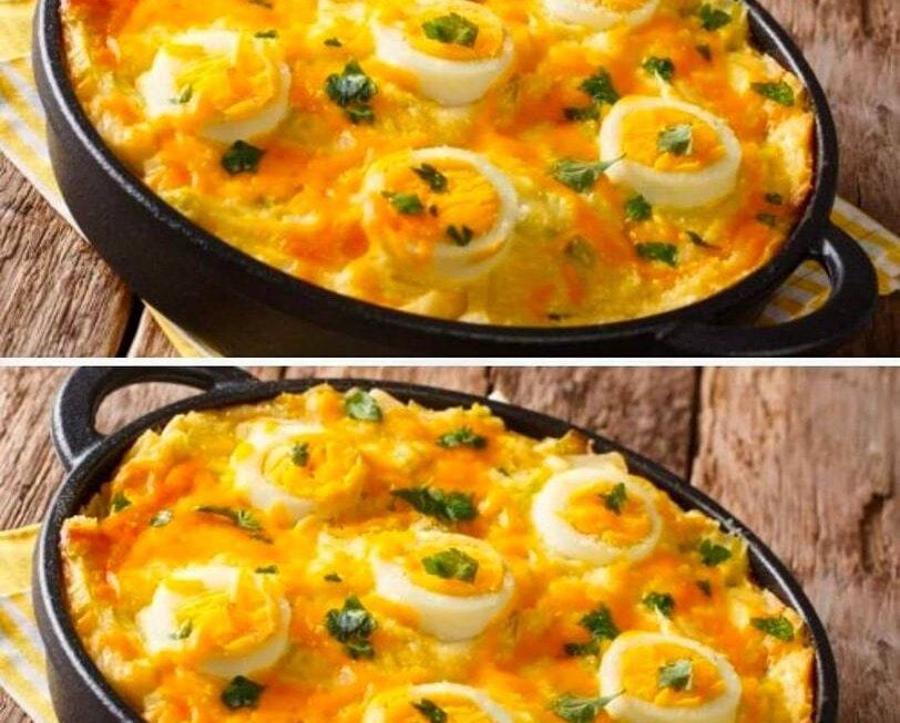 9. Graissez un plat allant au four avec un peu d’huile et ajoutez les poireaux avec la purée de pommes de terre. Lisser et déposer les œufs dessus en appuyant un peu avec les doigts.