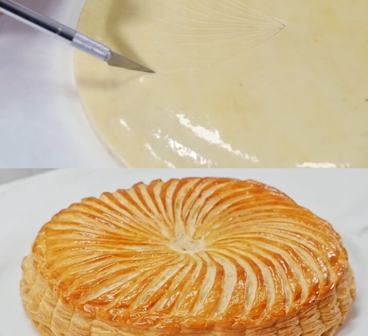 - Disposer une abaisse de pâte feuilletée, pocher la crème frangipane en laissant un espace sur les bords.
