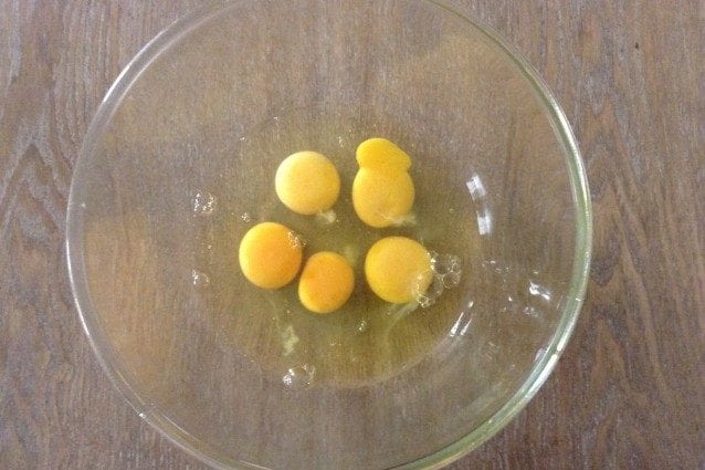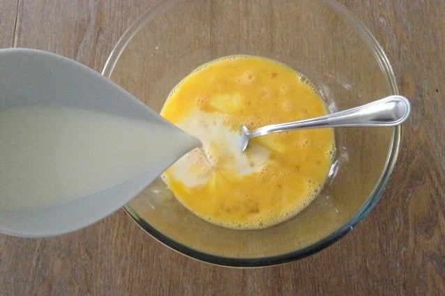 Pour préparer le mélange des crêpes, mettez les œufs dans un bol (1), battez-les (2) puis ajoutez le lait et une pincée de sel (3).