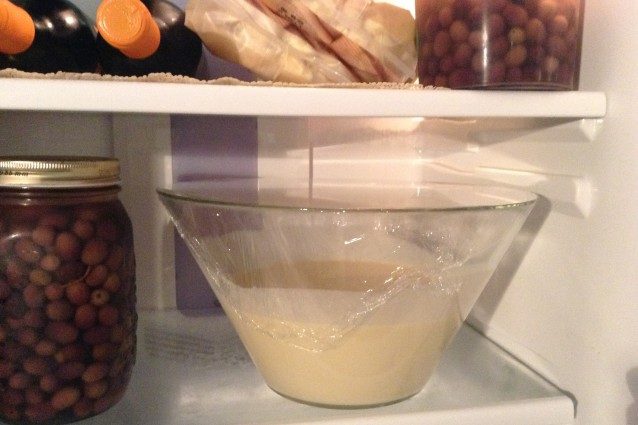 Tamisez la farine et mettez-la dans le mélange (4), ajoutez le beurre fondu et refroidi et mélangez le tout en éliminant les grumeaux jusqu’à obtenir un mélange homogène (5). Laissez reposer au réfrigérateur pendant au moins 30 minutes (6).