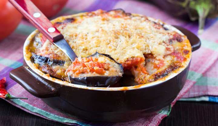 Par dessus la couche de pommes de terre, étaler la moitié de la viande hachée avec la tomate, puis la moitié des aubergines, puis l’autre moitié de viande, puis l’autre moitié des aubergines, un filet d’huile d’olive et terminer par la béchamel.