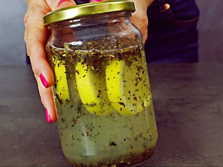 Ajoutez ensuite 100 ml d’éthanol à 96 % dans le pot. L’éthanol agit comme un solvant , extrayant les ingrédients actifs des herbes et contribuant à rendre le répulsif plus efficace. Laissez reposer le pot quelques instants et, pendant ce temps, coupez un citron en tranches et placez-le dans le récipient avec les ingrédients précédemment ajoutés .