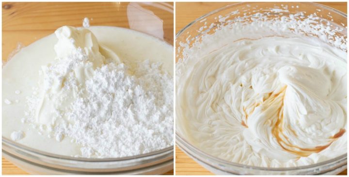 Dans un grand bol, mettre le mascarpone, la crème, le sucre glace et l’extrait de vanille. Fouettez le tout pendant 2-3 minutes avec le fouet électrique à vitesse moyenne.