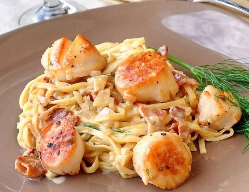 Linguine aux pétoncles dans une sauce carbonara