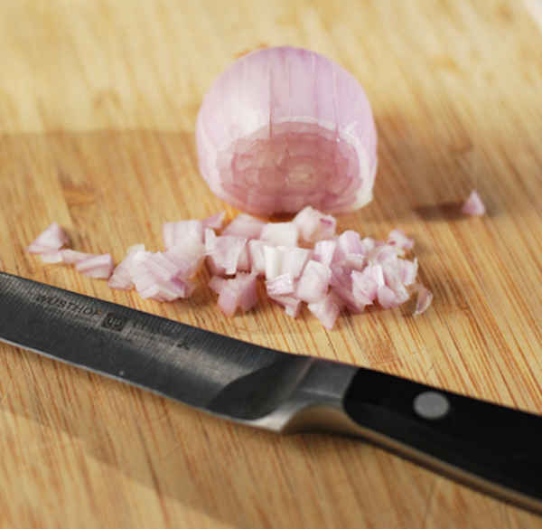 Taillez des petites tranches horizontales et verticales dans l’échalote avant de la hacher (comme sur la photo).
