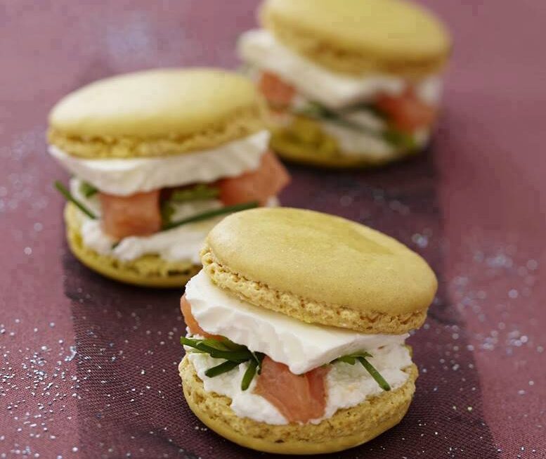12. Mettez le tout dans une poche à douille avec un embout cannelé et dressez un peu de fromage sur la moitié des coques. Ensuite déposez une petite lamelles de saumon fumé et une autre coque.