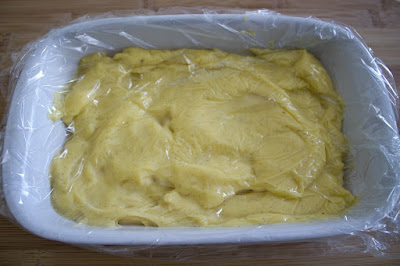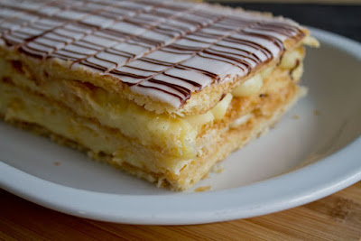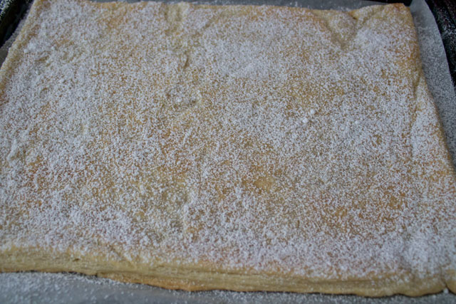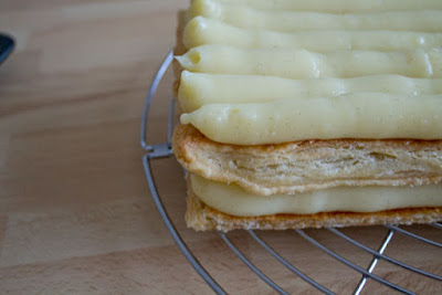 Positionner une seconde plaque de pâte feuilletée sur le dessus et étaler une seconde couche de crème pâtissière et enfin disposer la dernière plaque de pâte feuilletée.