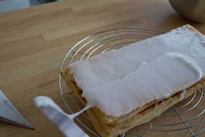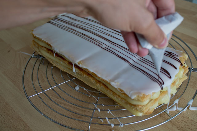 Étaler uniformément le glaçage blanc sur l’ensemble du mille-feuille.