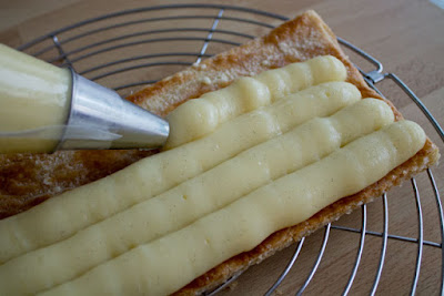 Montage : prendre une première plaque de pâte feuilletée et étaler la crème pâtissière régulièrement avec une poche à douille